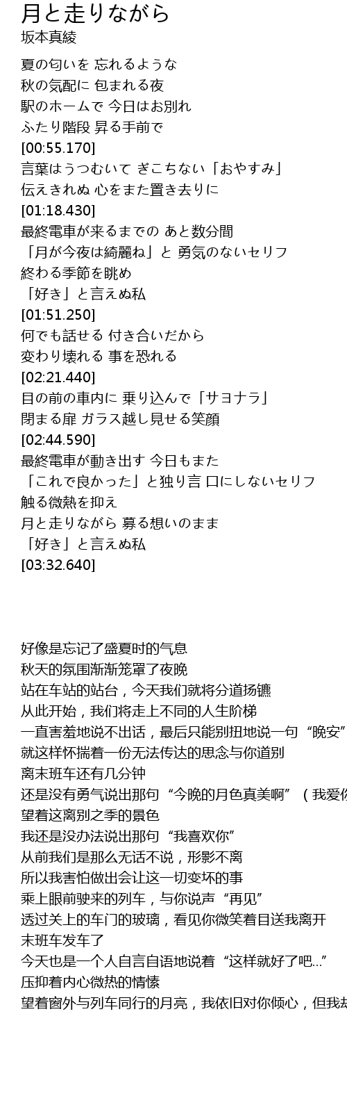 | [03:15.820] | 月と走りながら 募る想いのまま 「好き」と言えぬ私 |