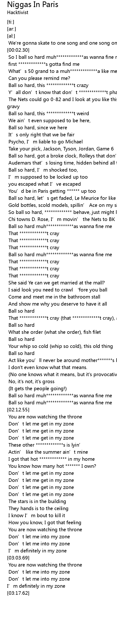 | [00:26.11] | Ball so hard, this *************t crazy |
