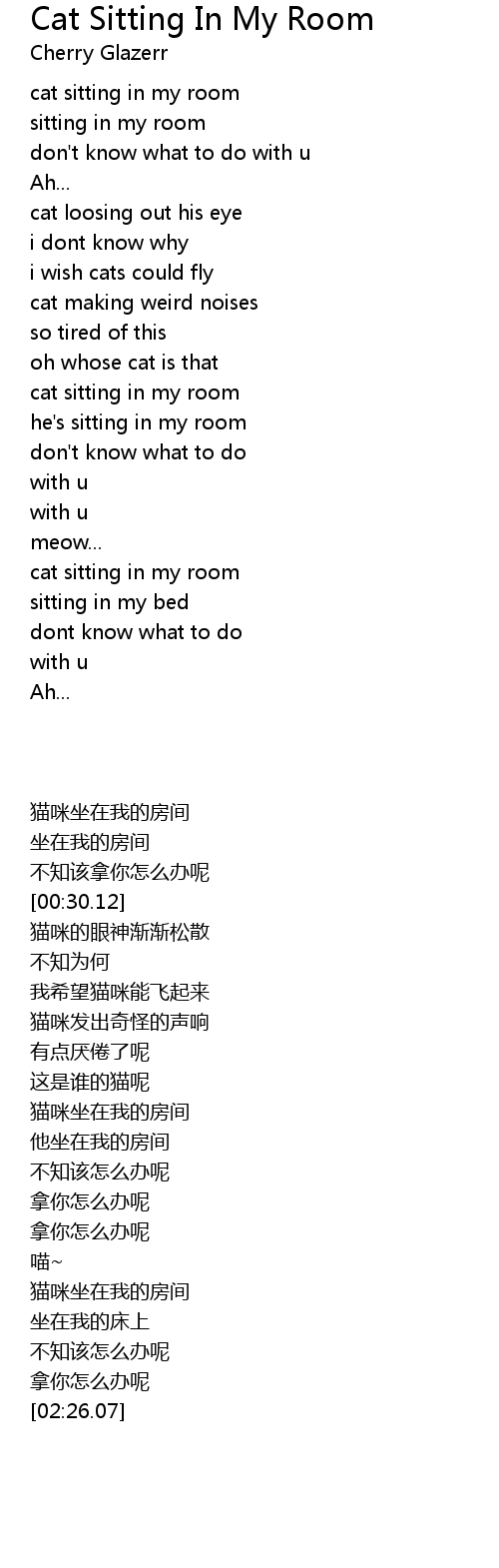 | [00:15.08] | cat sitting in my room |