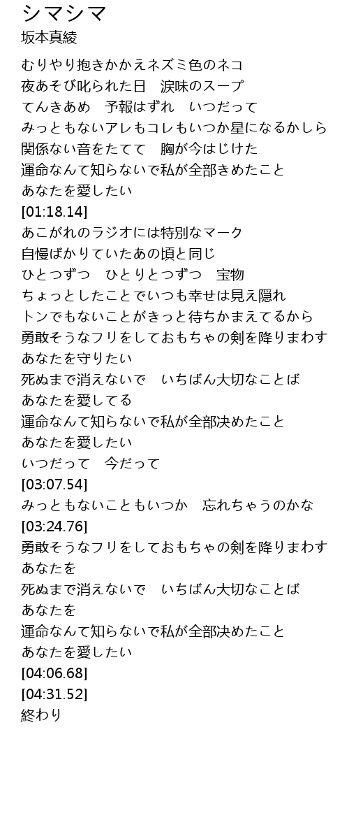 | [00:19.47] | むりやり抱きかかえネズミ色のネコ |