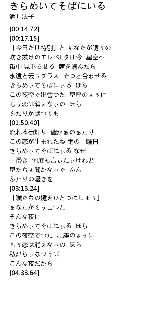 | [02:31.41] | きらめぃてそばにぃる なぜ |
