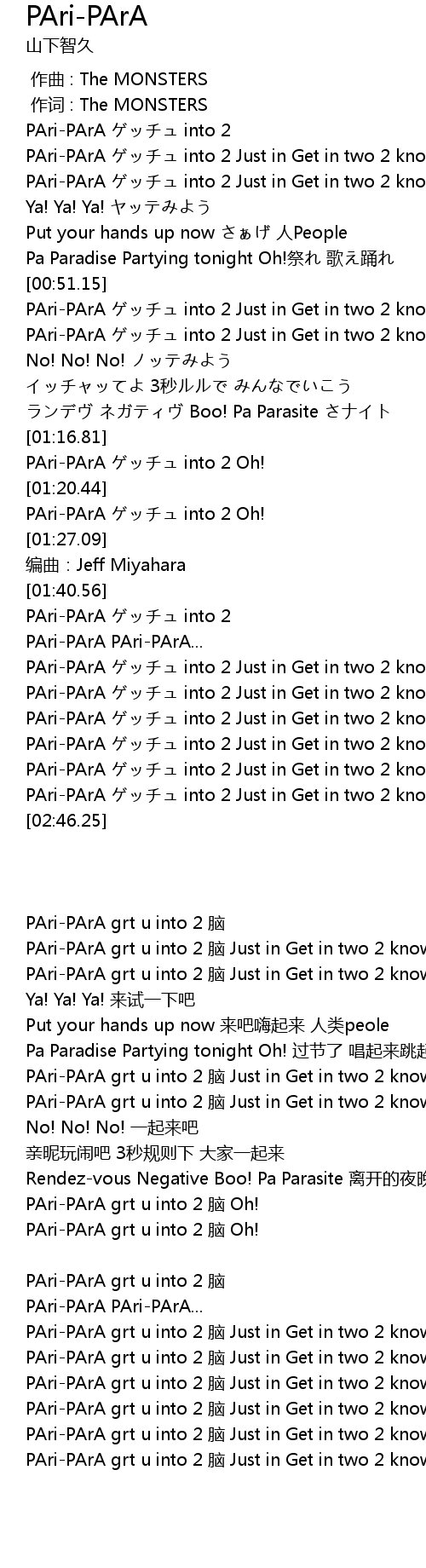 | [02:01.75] | PAri-PArA ゲッチュ into 2 Just in Get in two 2 know |