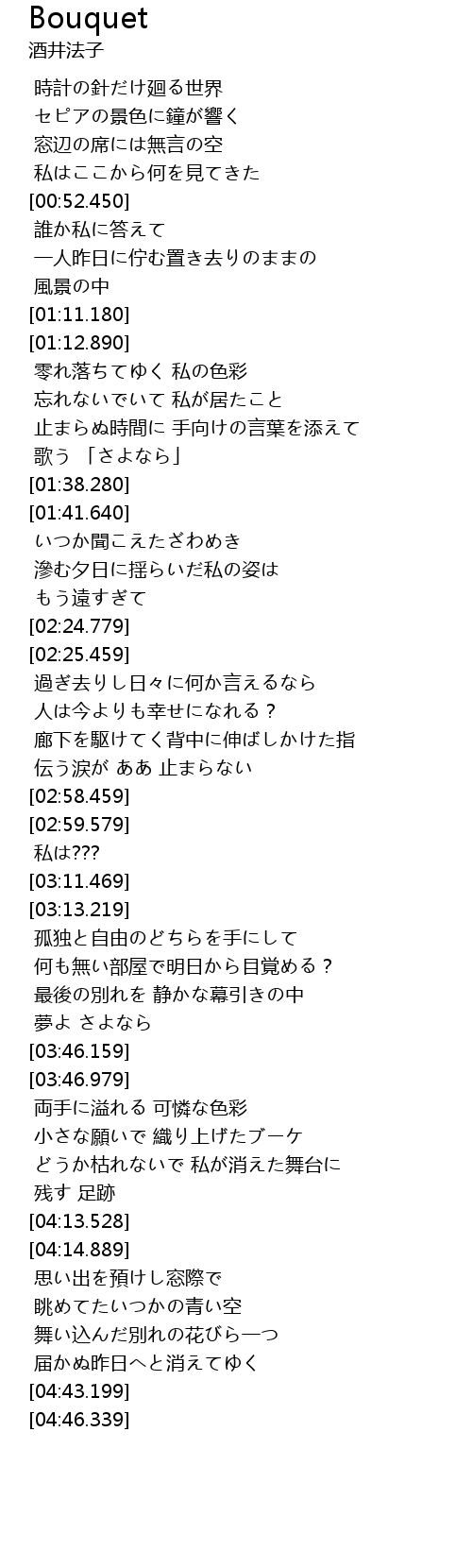 | [03:54.349] | 小さな願いで 織り上げたブーケ |