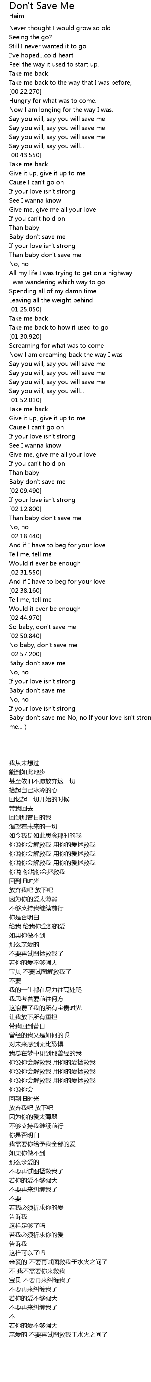| [03:14.760] | Baby don' t save me No, no If your love isn' t strong don' t save me... |