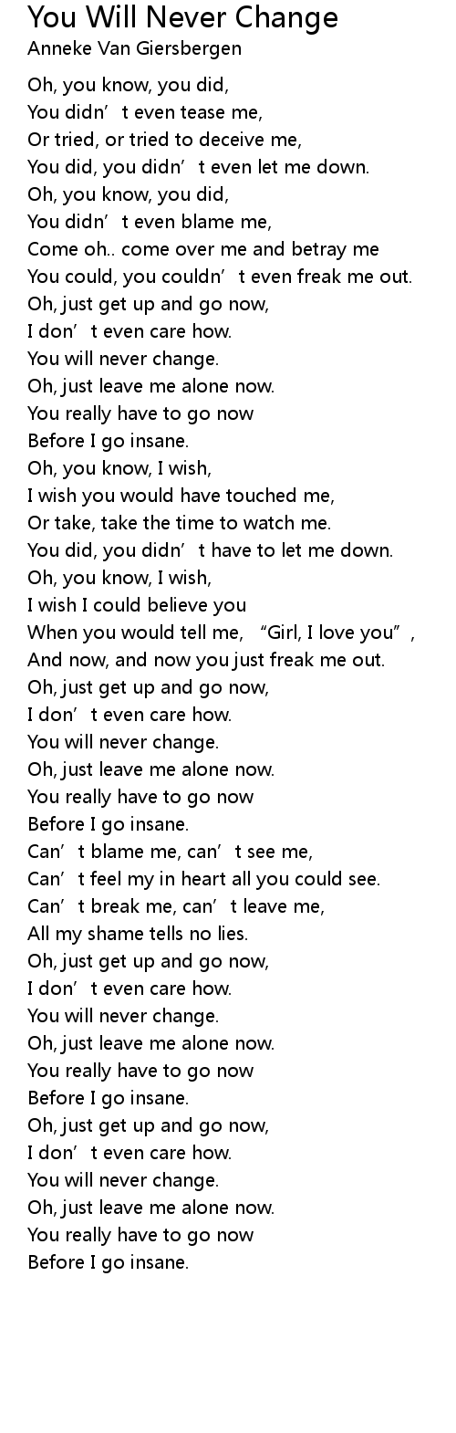 | Song | You Will Never Change |