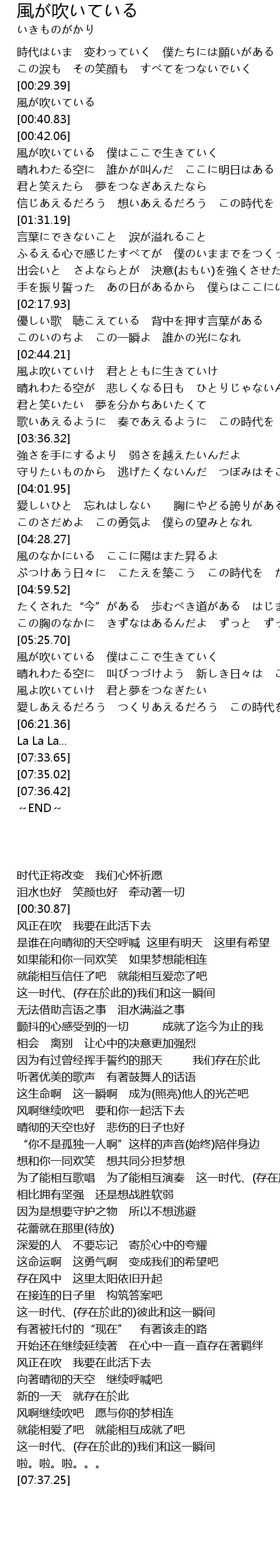 | [00:43.60] | 風が吹いている 僕はここで生きていく |