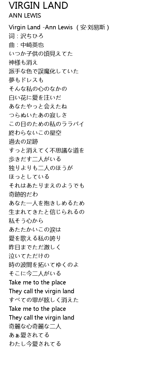 | [00:00.181] | Virgin Land -Ann Lewis (安·刘易斯) |