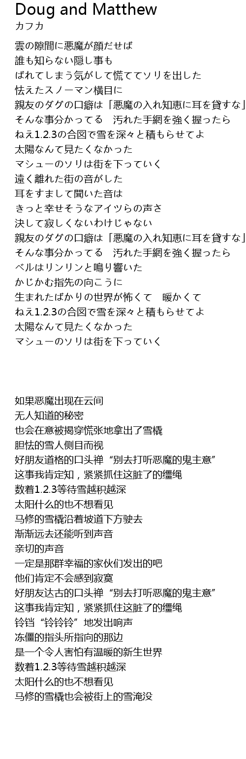 | [00:38.75] | 親友のダグの口癖は「悪魔の入れ知恵に耳を貸すな」 |