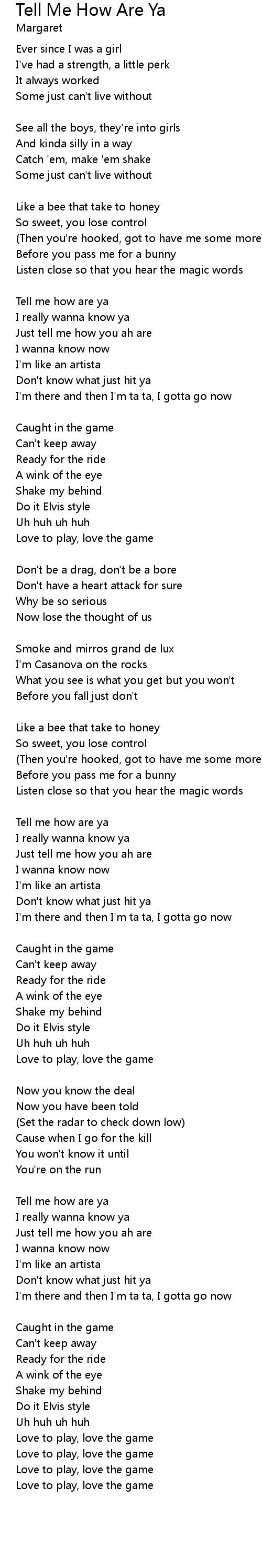 Tell me how are ya |
