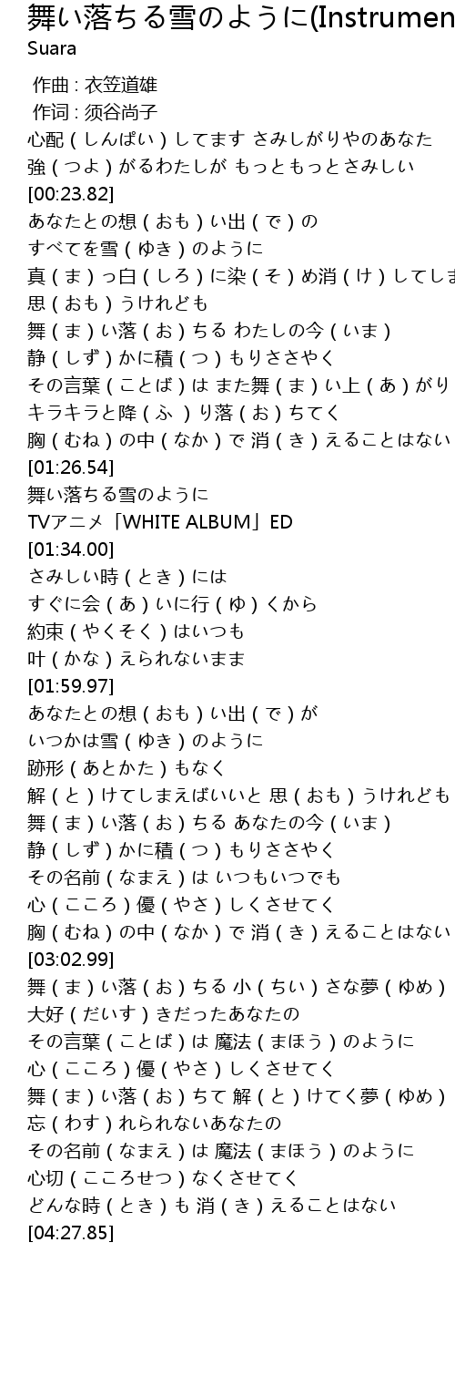 | [02:27.94] | 舞(ま)い落(お)ちる あなたの今(いま) 静(しず)かに積(つ)もりささやく |