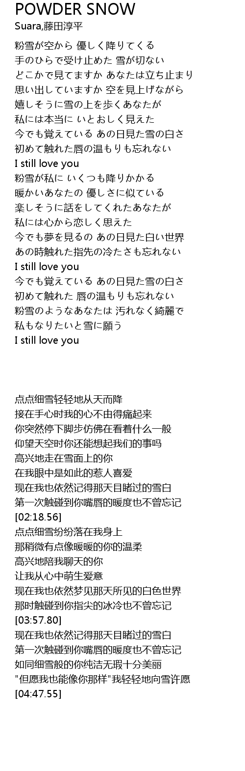 | [02:41.06] | 粉雪が私に いくつも降りかかる |