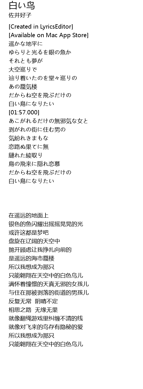 | [01:34.000] | 白い鳥になりたい |