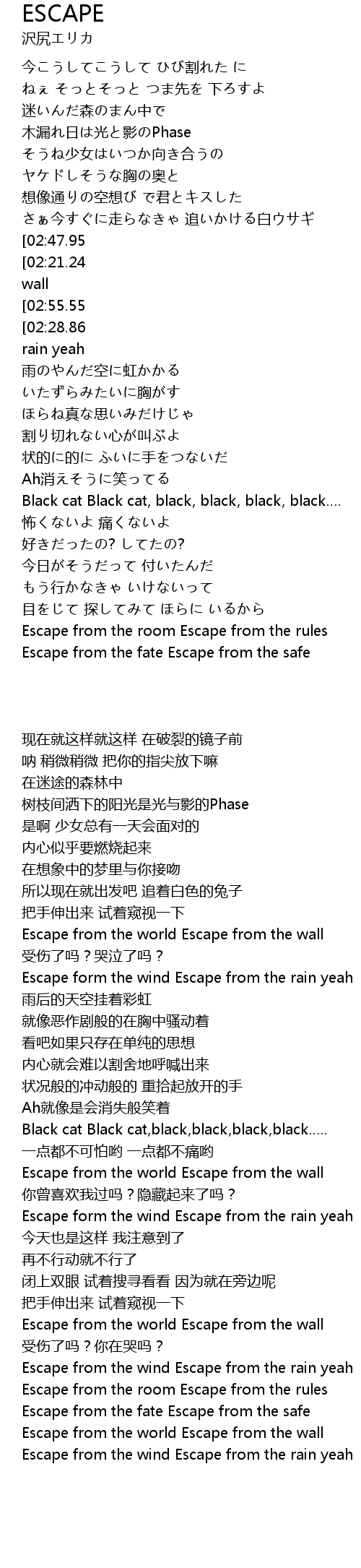 | [01:20.31][02:21.24][02:51.73][03:10.73] | Escape from the world Escape from the wall |