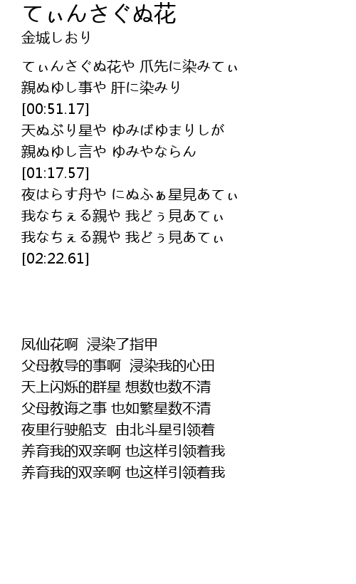 てぃんさぐぬ花や 爪先に染みてぃ |