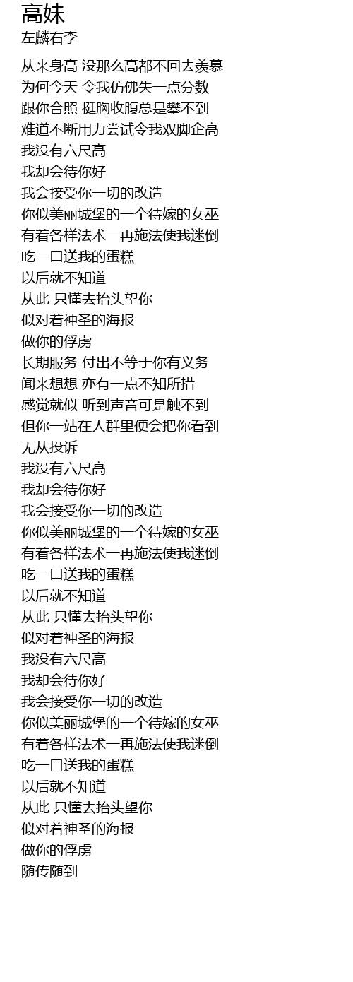 | [00:16.250] | 从来身高 没那么高都不回去羡慕 |