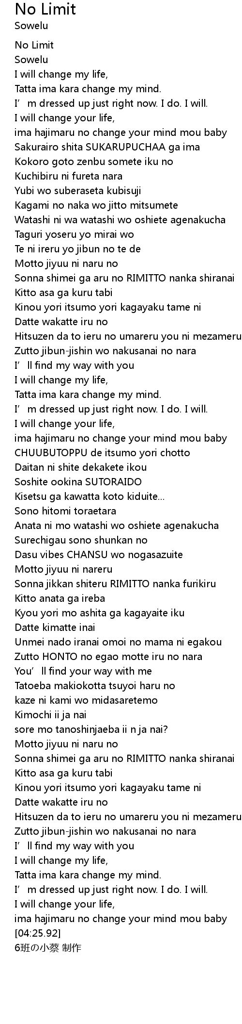 | [04:21.95] | ima hajimaru no change your mind mou baby |
