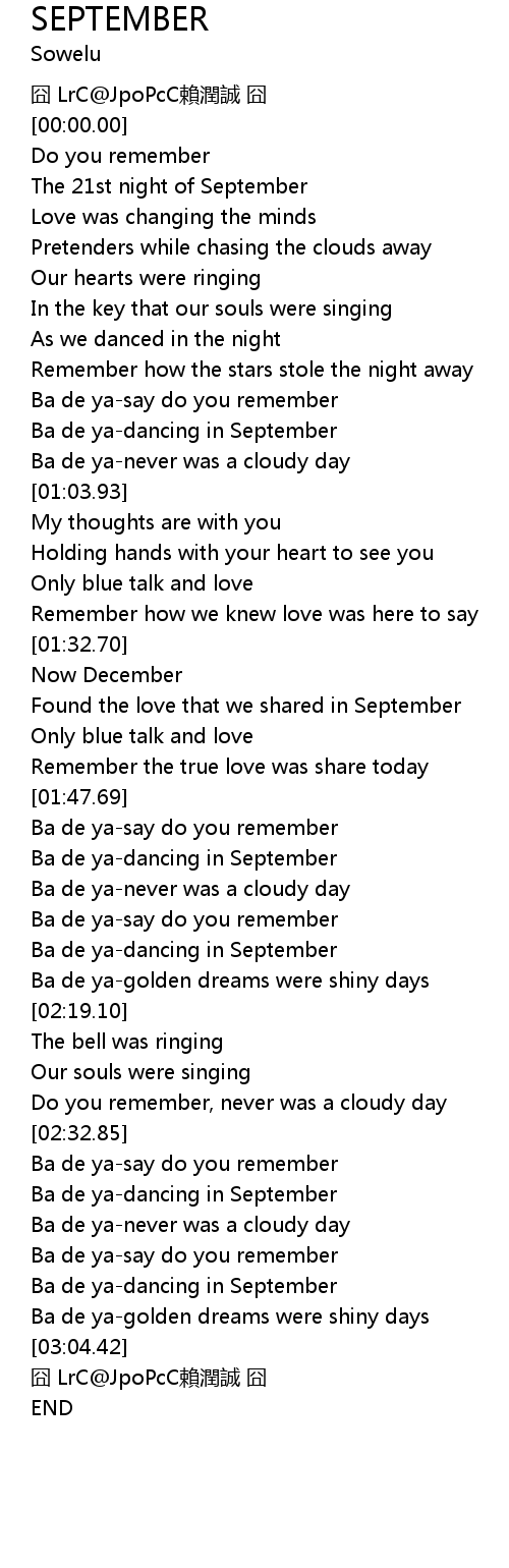 | [02:38.20] | Ba de ya-dancing in September |