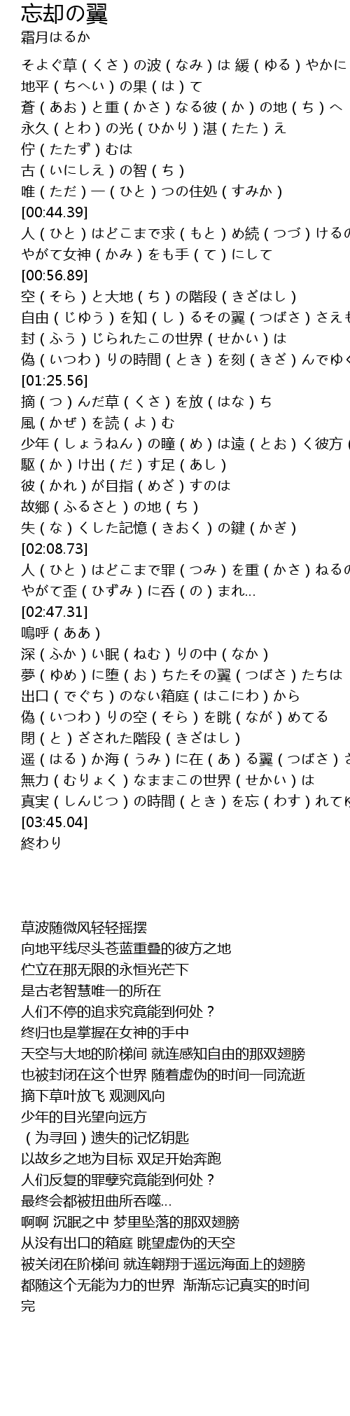 | [03:16.25] | 閉(と)ざされた階段(きざはし) 遥(はる)か海(うみ)に在(あ)る翼(つばさ)さえも |