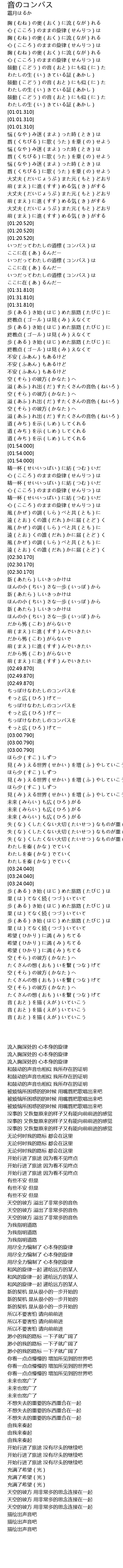 | [02:50.020] | ちっぽけなわたしのコンパスを そっと広(ひろ)げてー |
