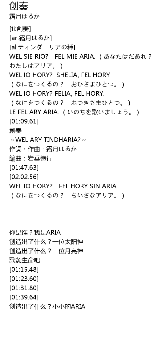| [00:08.45] | WEL SIE RIO? FEL MIE ARIA. (あなたはだあれ? わたしはアリア。) |