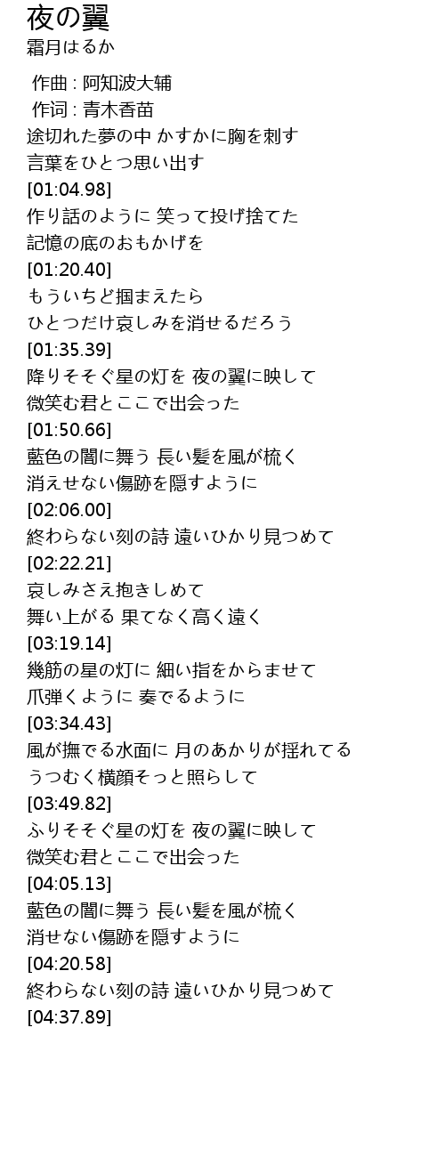 | [04:05.25] | 藍色の闇に舞う 長い髪を風が梳く |