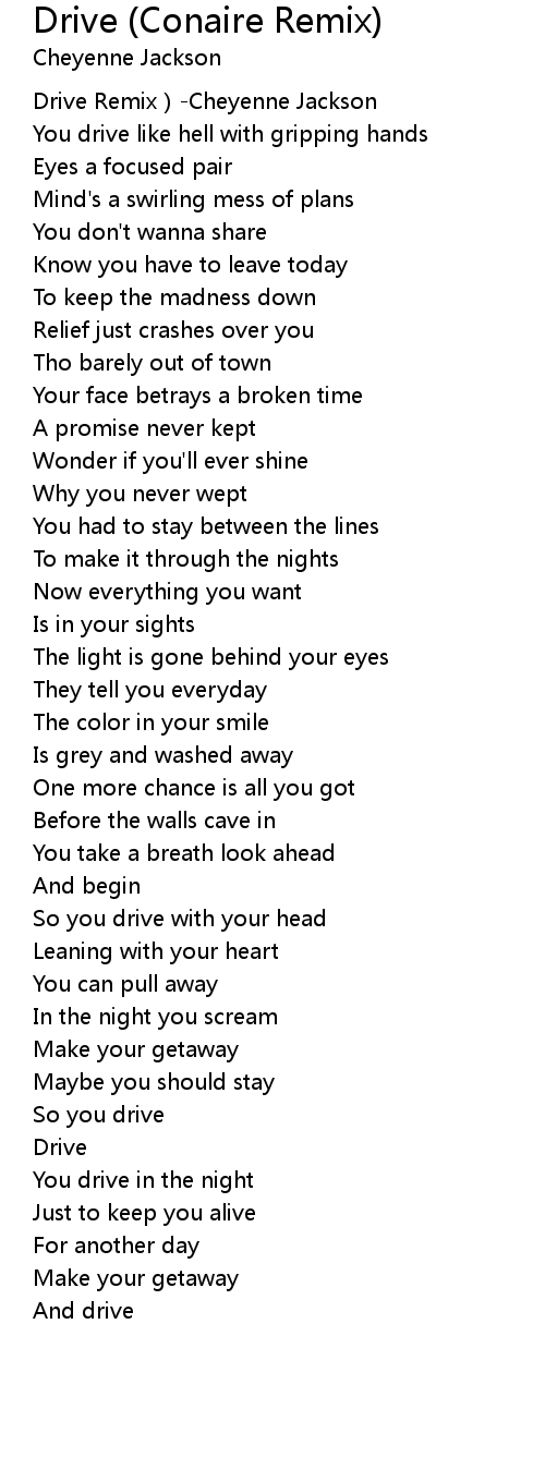 | [00:01.110] | Drive Remix Cheyenne Jackson |