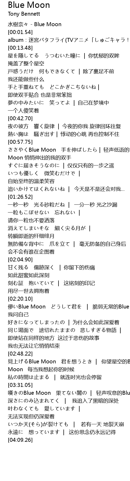 | [03:18.45] | jian shang Blue Moon jun xiang yang wang xing kong de Blue Moon mei dang wo xiang qi ni de shi hou |