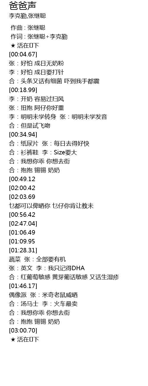 | [00:05.01] | 张:好怕 成日无奶粉 |