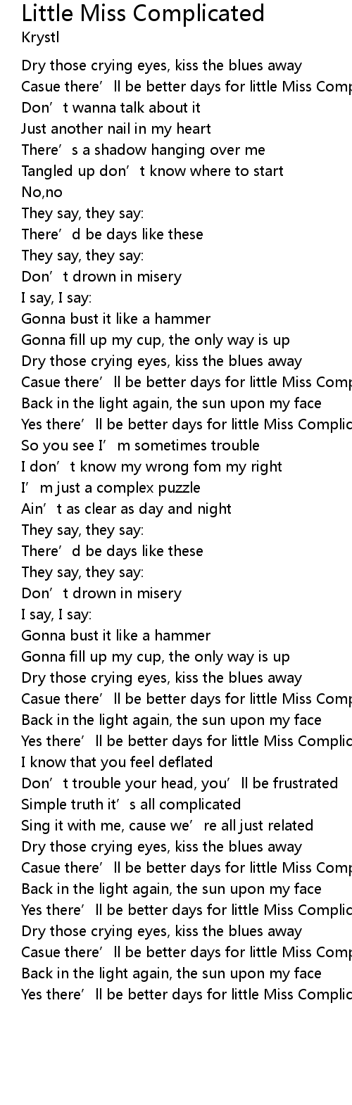 | [00:58.67] | Casue there' ll be better days for little Miss Complicated |