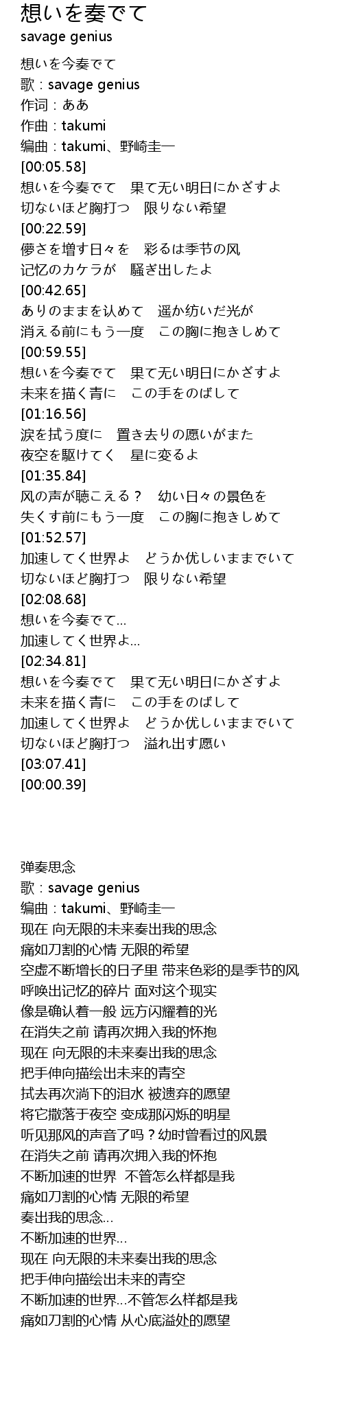 | [02:38.44] | 想いを今奏でて 果て无い明日にかざすよ |