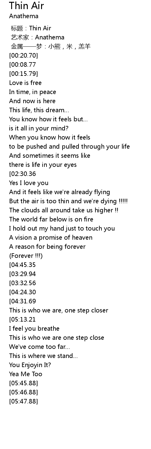 | [01:49.11] | But the air is too thin and we're dying !!!!! |