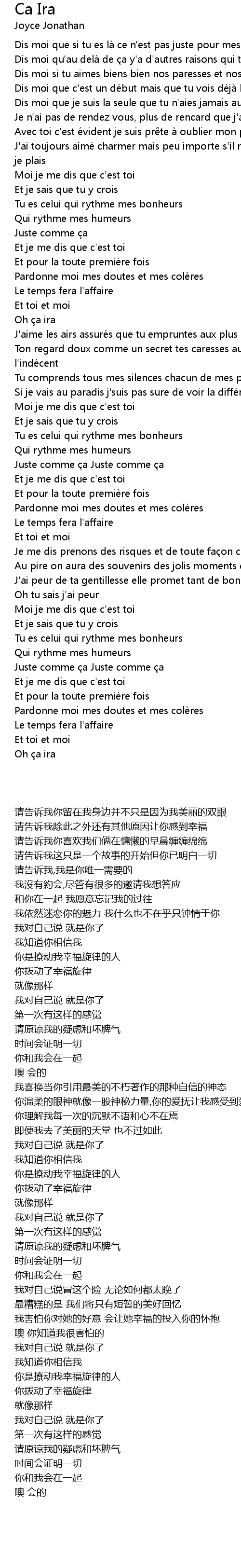 | [00:21.59] | Dis moi que c' est un dé but mais que tu vois dé jà la suite à deux |