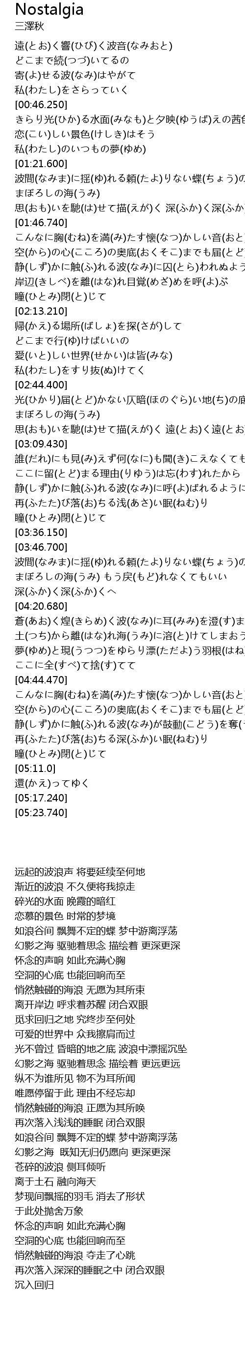 | [00:35.600] | 寄(よ)せる波(なみ)はやがて 私(わたし)をさらっていく |