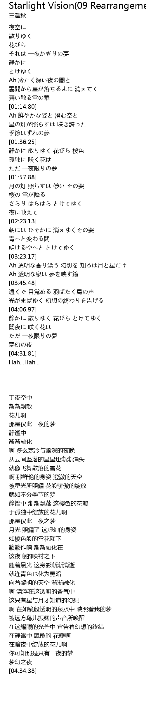 | [03:24.37] | Ah 透明な香り漂う 幻想を 知るは月と星だけ |
