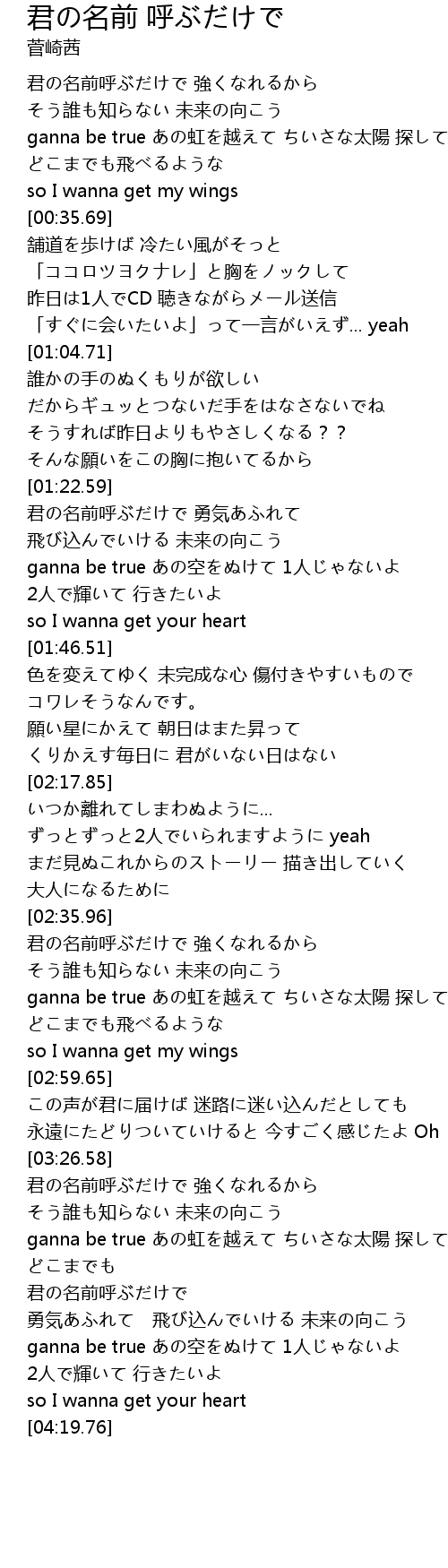 | [00:21.02] | ganna be true あの虹を越えて ちいさな太陽 探して どこまでも飛べるような |