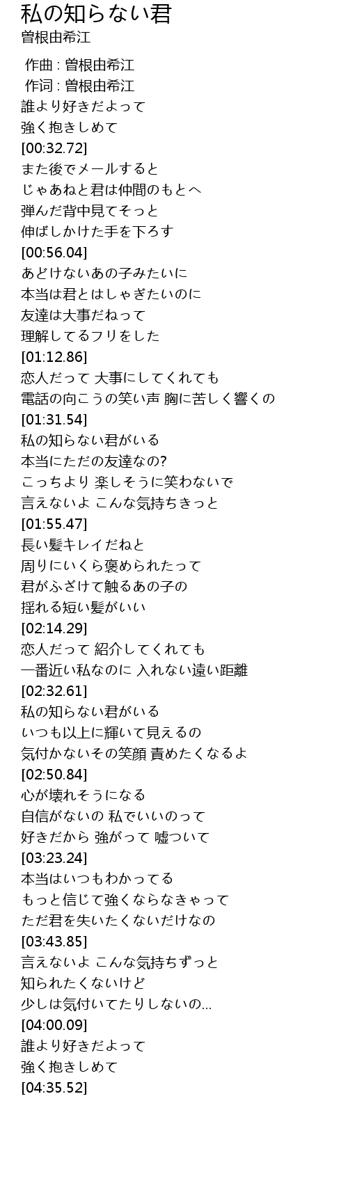 | [02:32.85] | 私の知らない君がいる |