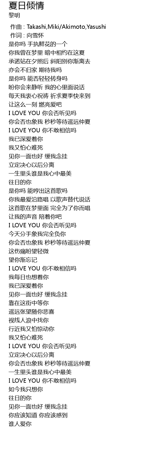 | [01:16.39] | I LOVE YOU nǐ huì fǒu tīng jiàn ma |