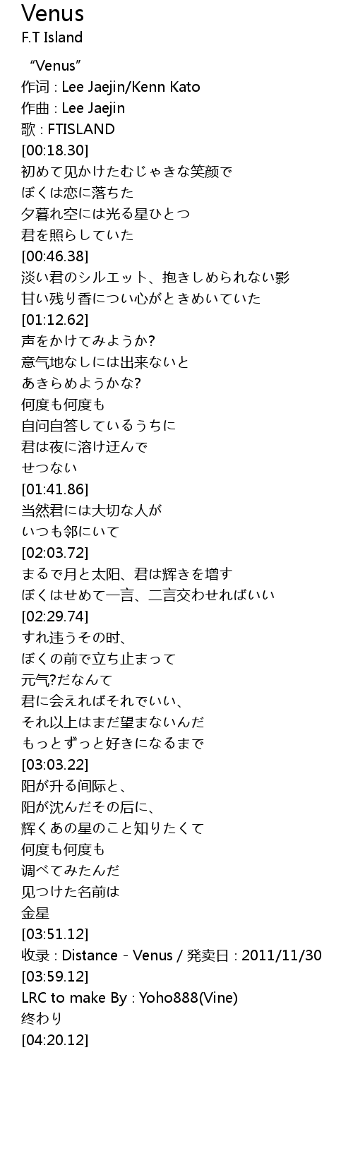 | [03:54.12] | shōu lù Distance Venus fā mài rì 2011 11 30 |