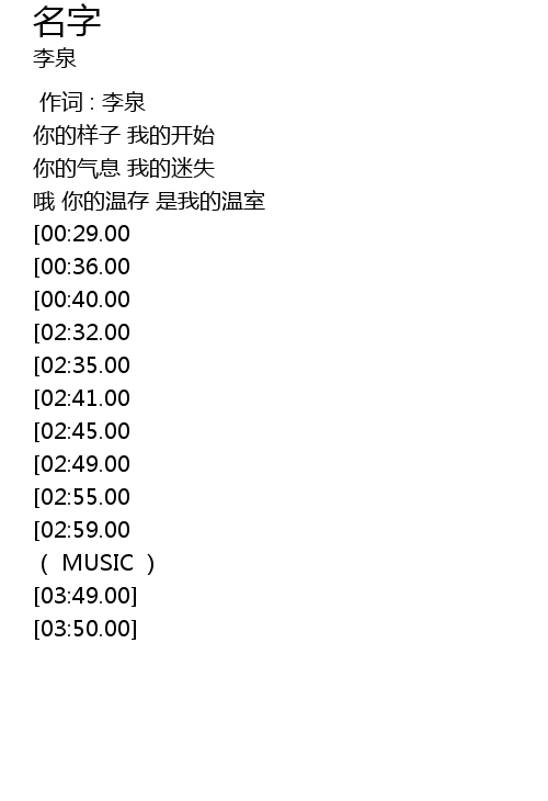 | [03:39.00][02:59.00][01:19.00] | wo de gu shi ta you le ni de ming zi |