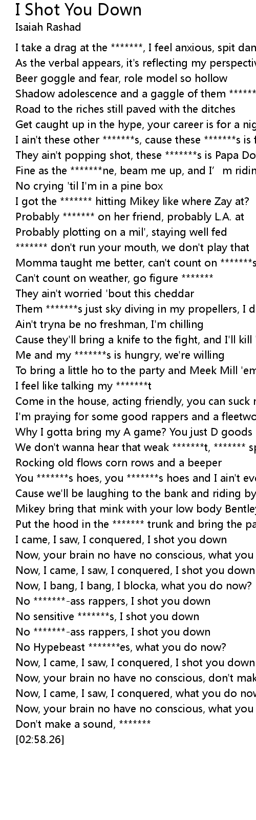 | [02:21.15] | No *******-ass rappers, I shot you down |