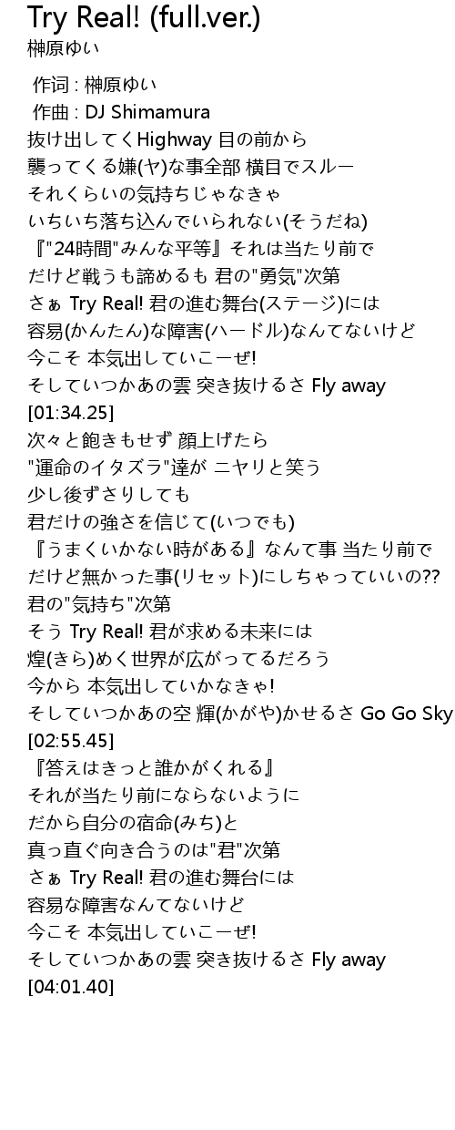 | [02:28.53] | Try Real! jun qiu wei lai |