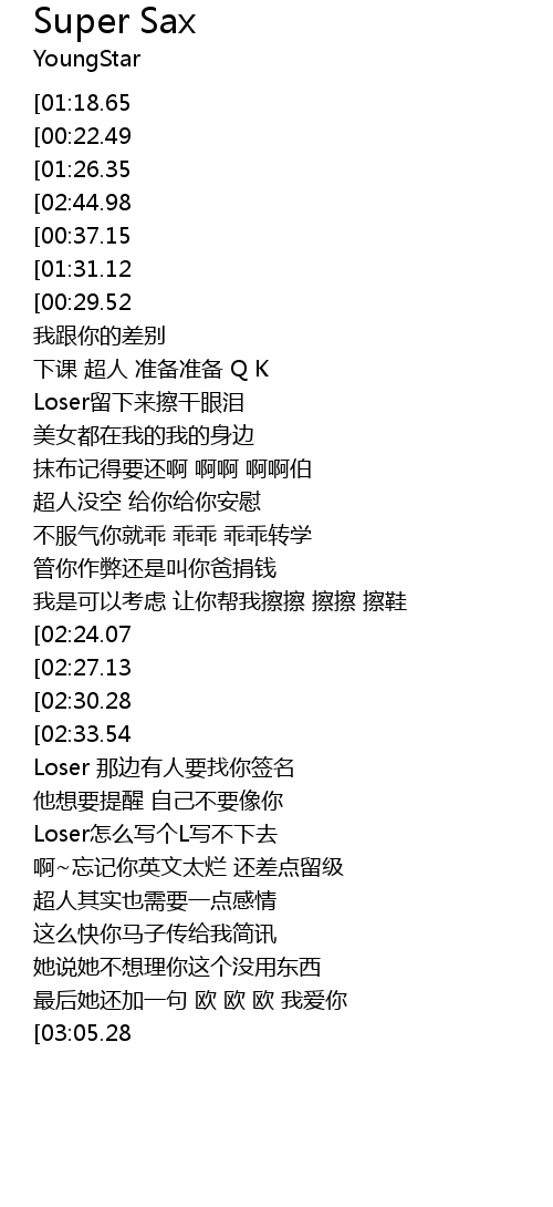 | [02:43.24][02:44.98][02:46.60][02:56.66][02:58.16][02:59.60] | year~我是superman |