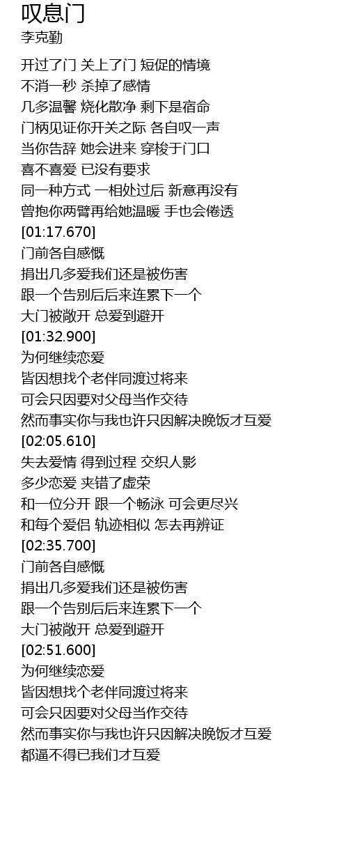 | [00:41.270] | 门柄见证你开关之际 各自叹一声 |