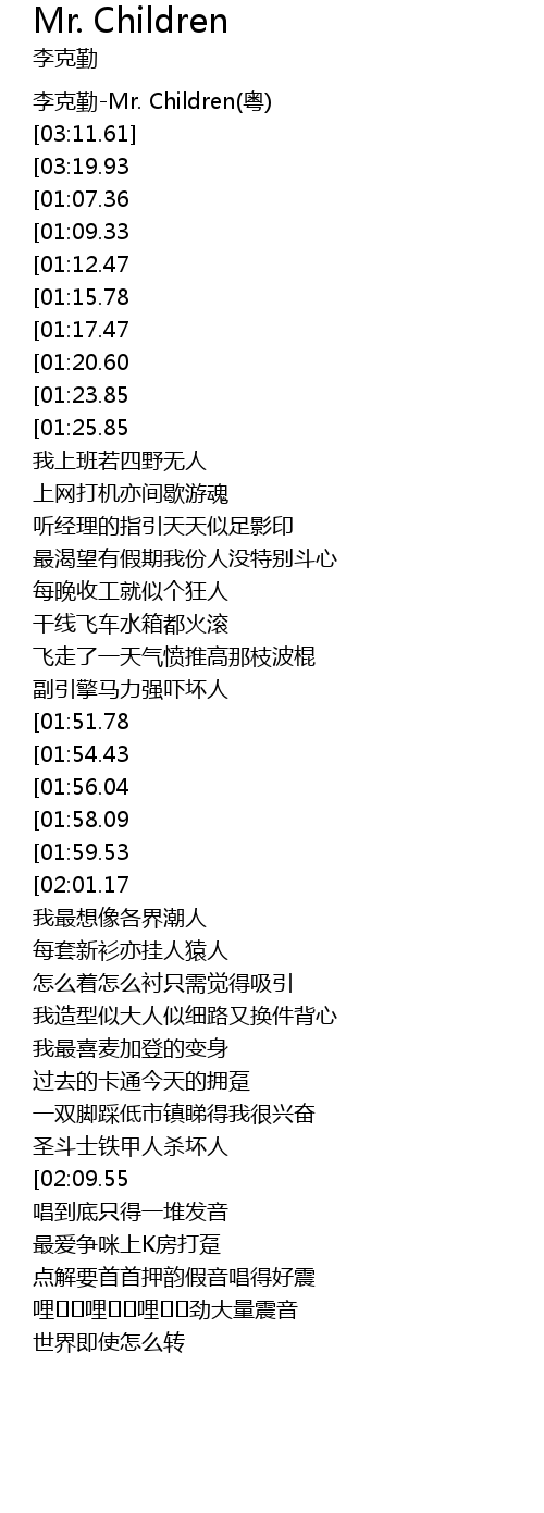 | [00:00.73] | 李克勤-Mr. Children(粤) |