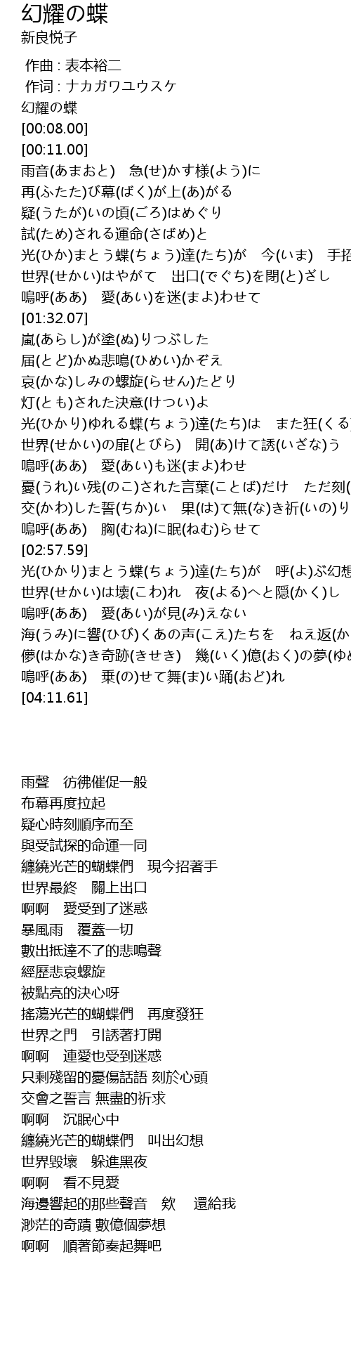 | [03:31.38] | 光(ひかり)まとう蝶(ちょう)達(たち)が 呼(よ)ぶ幻想(げんそう) |