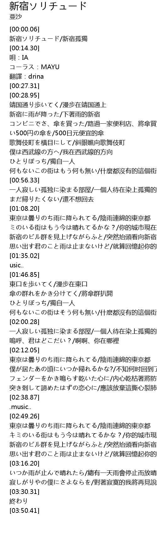 | [00:00.71] | 新宿ソリチュード/新宿孤獨 |