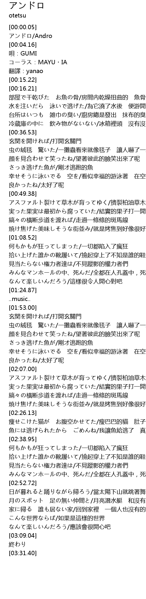 | [02:50.20] | みんなマンホールの中、死んだ/全都在人孔蓋中,死掉了 |