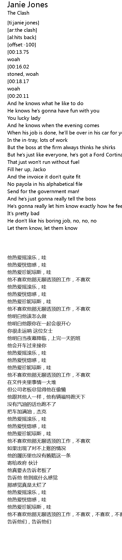 | [00:09.46][00:18.17][00:46.10][01:13.78][01:41.65] | He's in love with Janie Jones, woah |