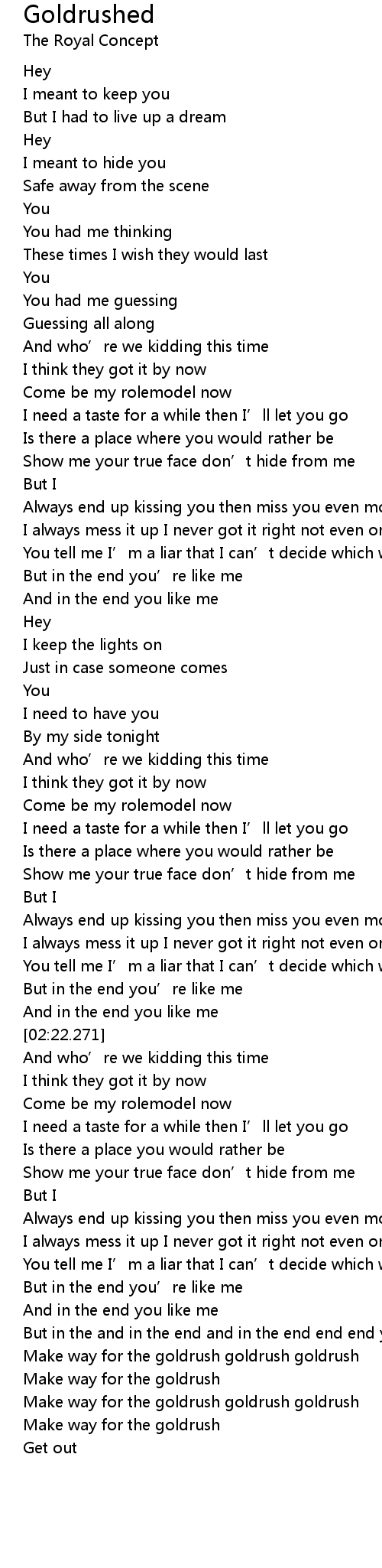 | [03:33.321] | Make way for the goldrush goldrush goldrush |