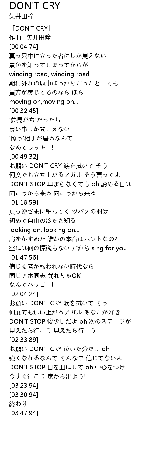 | [02:04.85] | お願い DON'T CRY 涙を拭いて そう |